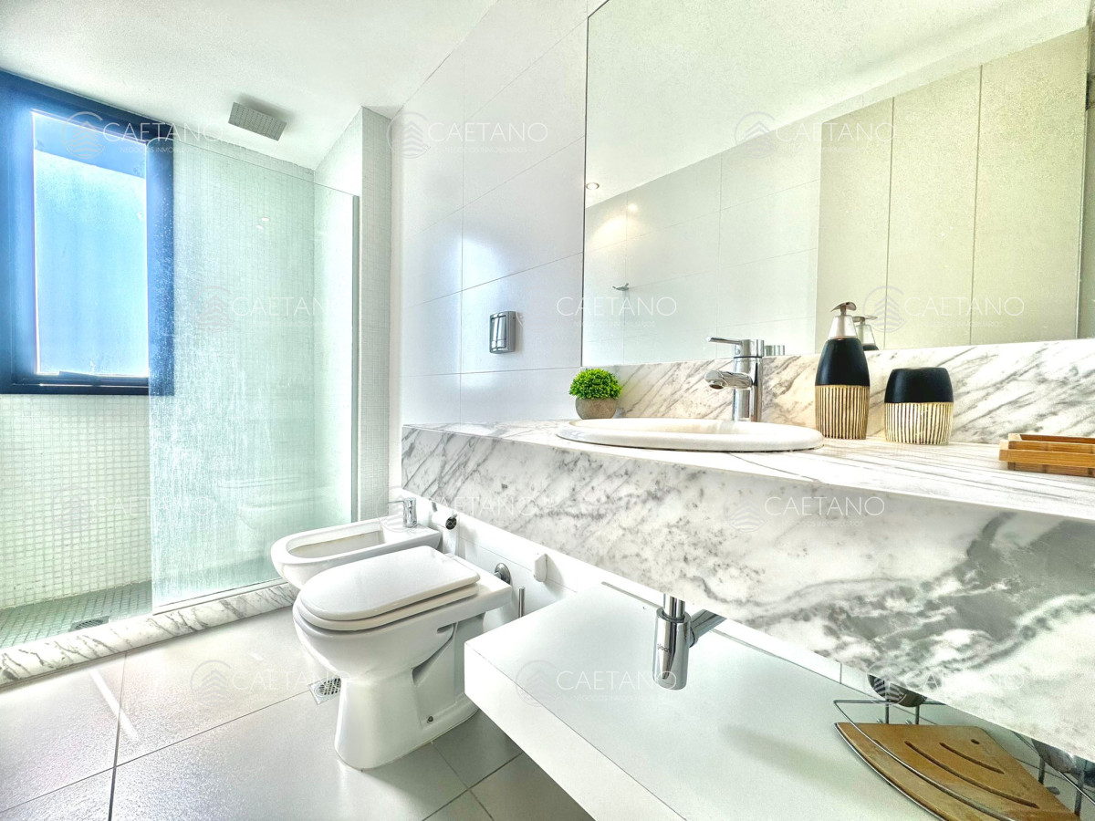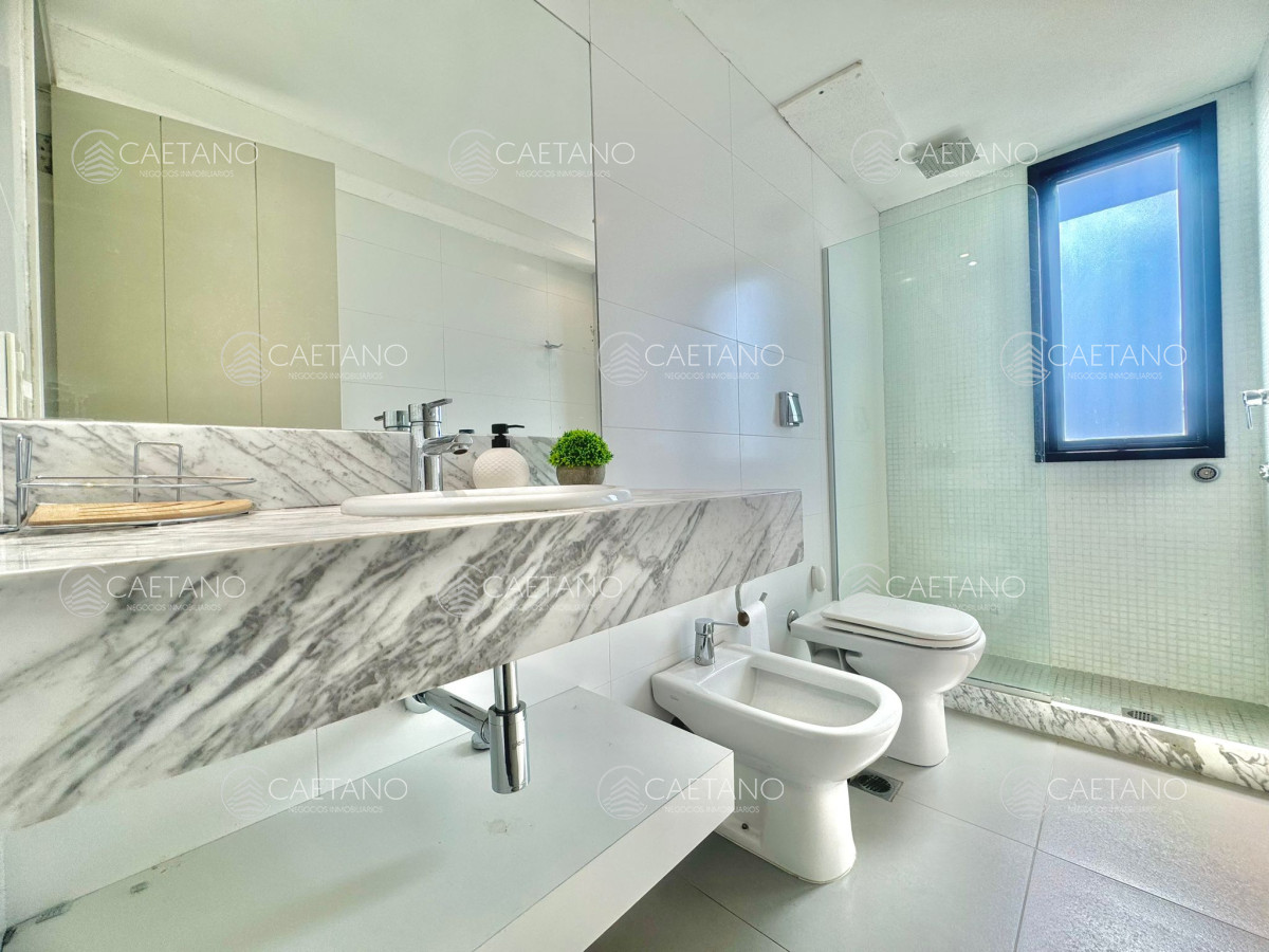 Cuenta con dos espaciosos dormitorios, el principal en suite, dos baños completos más toilette. Cocina integrada con desayunador, muy bien equipada.