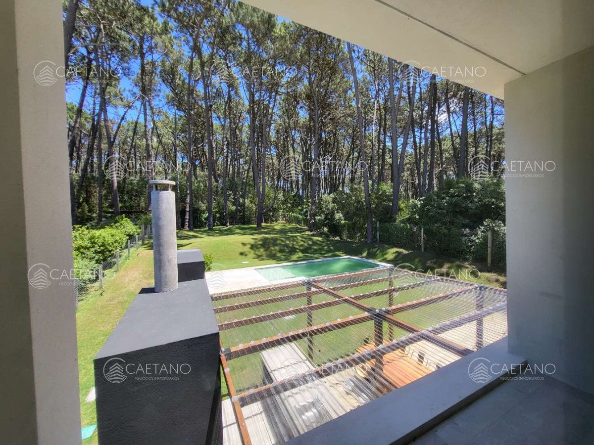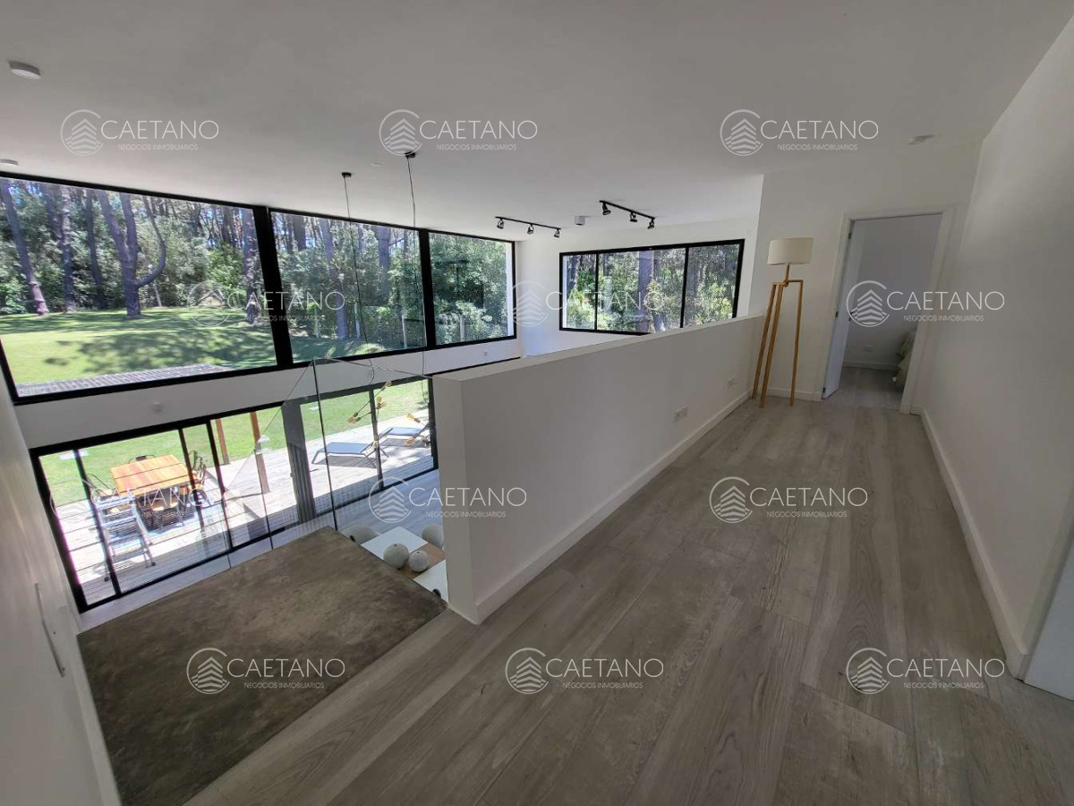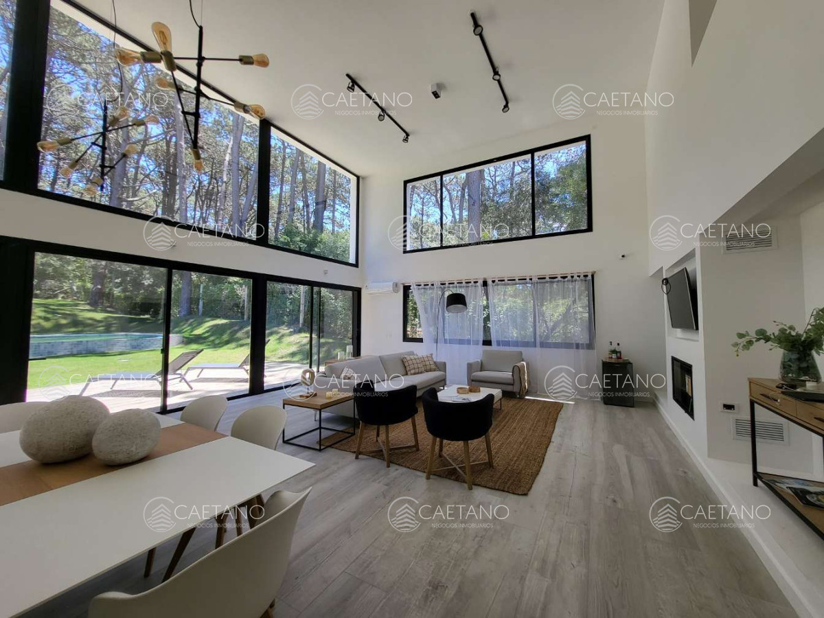 - Living-comedor con doble altura y vistas al bosque. Salida a deck con parrillero, piscina infinita y amplio jardín.
