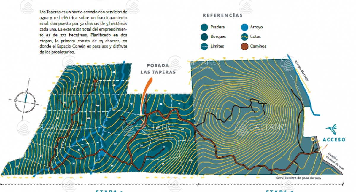 Un Barrio Rural que conjuga su impactante Naturaleza con una Infraestructura Premium. Sobre 300 hectáreas se diseñó un Master plan con chacras de 5 hectáreas y 12 hectáreas de espacios comunes donde se ubica la Posada Boutique, Casa de caseros, Galpón, Caballerizas, Muelle, Huerta y Frutales, Senderos, Arroyos y Cascadas.